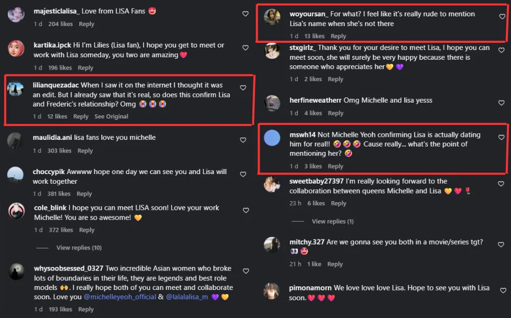 The carousel of pictures posted by Yeoh sparked flurries of comments from netizens as her caption seemingly takes a jab at the couple’s relationship. Most netizens show support for the two renowned Asian artists. However, questions remain whether this confirms that their relationship. Instagram user @/lilianquezadac comments, “When I saw it on the internet, I thought it was an edit.. But now it’s real, so does this confirm Lisa and Frederic’s relationship?”.
