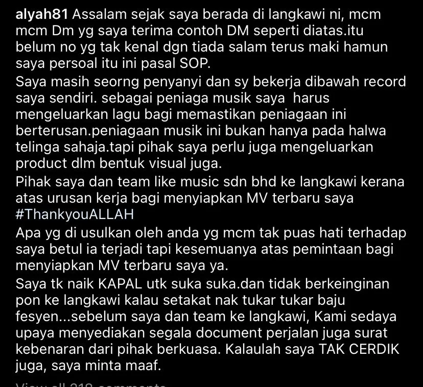 Alyah then explained, “My management team, in addition to Like Music Sdn. Bhd. travelled to Langkawi to film my latest music video for my song “#ThankYouAllah”. What was proposed by you (the netizen), who seems to be unhappy with me, it did happen. But everything is done as per requested in order to finish shooting the MV.”