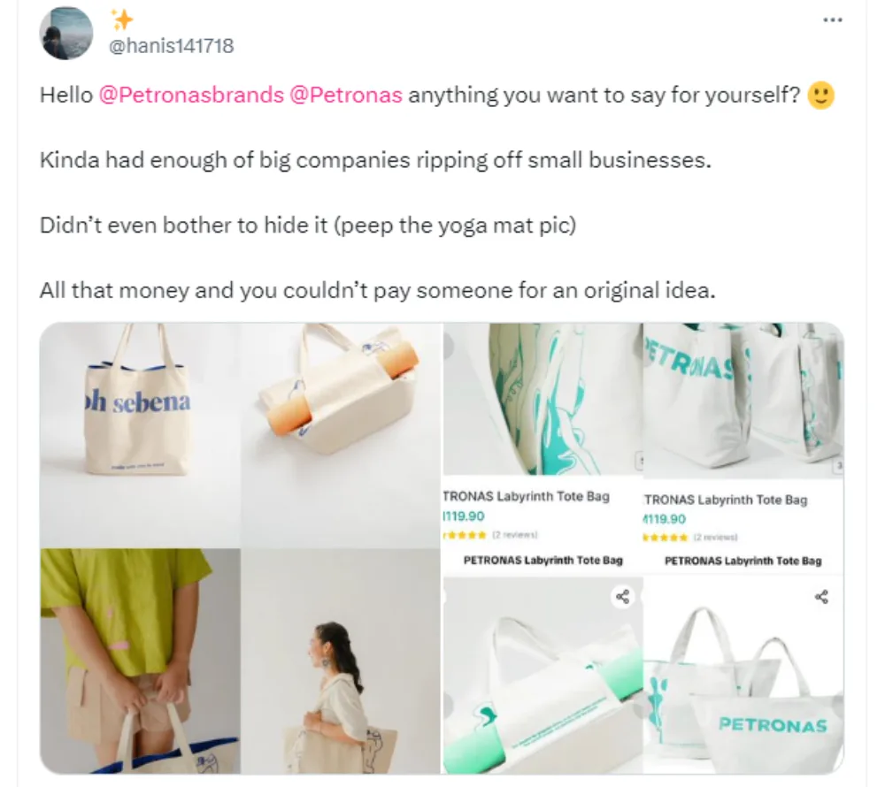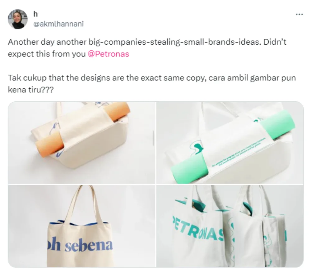 We know plagiarism is a huge no-no – but unfortunately, many small businesses have called out big businesses for copying their designs. However, is this a case of copying or just taking inspiration from a trending design? A Twitter user by the name of Hanis recently called out Petronas for copying a tote bag design from homegrown brand Oh Sebenar.