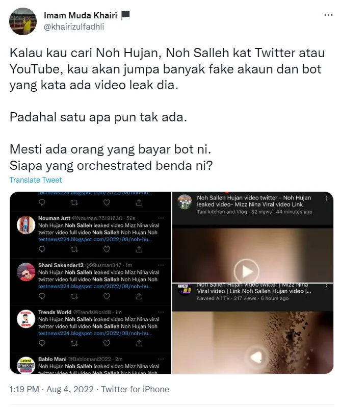 This has in turn prompted a Twitter user named Imam Muda Khairi to come forward with his own “theory” regarding the matter. He wrote on his caption, “If you searched for Noh Salleh or Noh Hujan on Twitter or even YouTube, you’ll most likely come across a lot of fake accounts and also bots that claimed that they have his leaked video. When in fact, none of them do exist. Someone must have paid these bots. Who orchestrated this?”