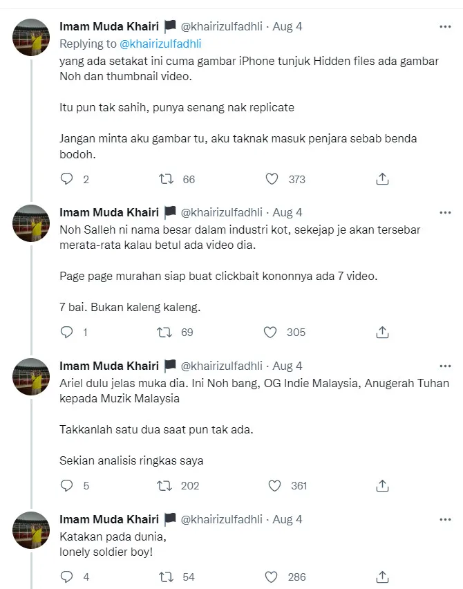 “Even those are not authentic, since they are easy to replicate. Please don’t ask me for the photos. I don’t want to go to jail for something stupid,” the netizen tweeted. “Noh Salleh is a big name in the music industry. If the videos do exist, it will only take a few seconds for the videos to go viral online. There are seven videos in total. This is no joke.”