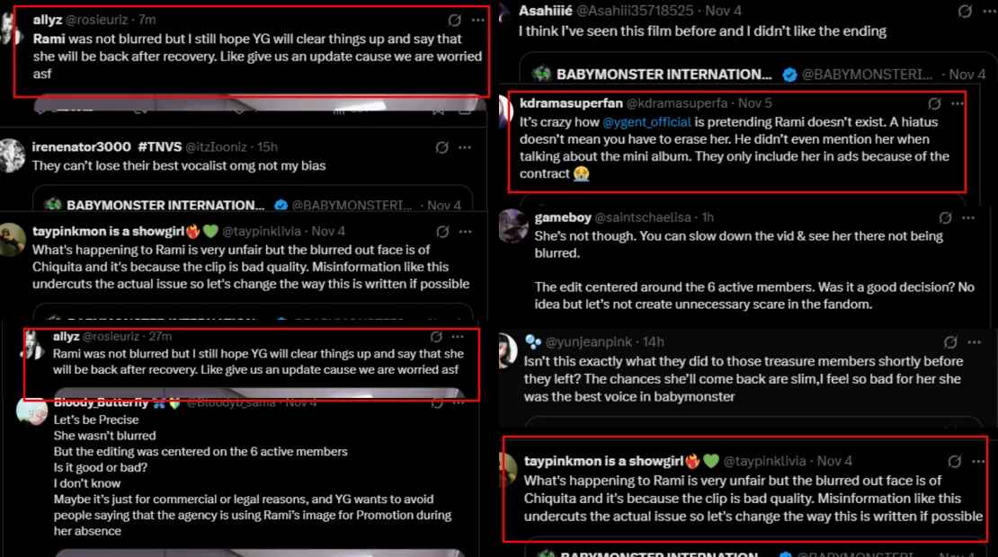 One Twitter user claimed that Rami had been edited or blurred out from the video’s intro, which featured BABYMONSTER during the group’s “SHEESH” and “DRIP” eras. This sparked concern among fans, who believe YG Entertainment is gradually erasing the singer’s contributions and accused the agency of failing to acknowledge her as an active member of the group while she’s on hiatus. Others also pointed out previous instances where certain idols under the company were edited out of existing group materials.