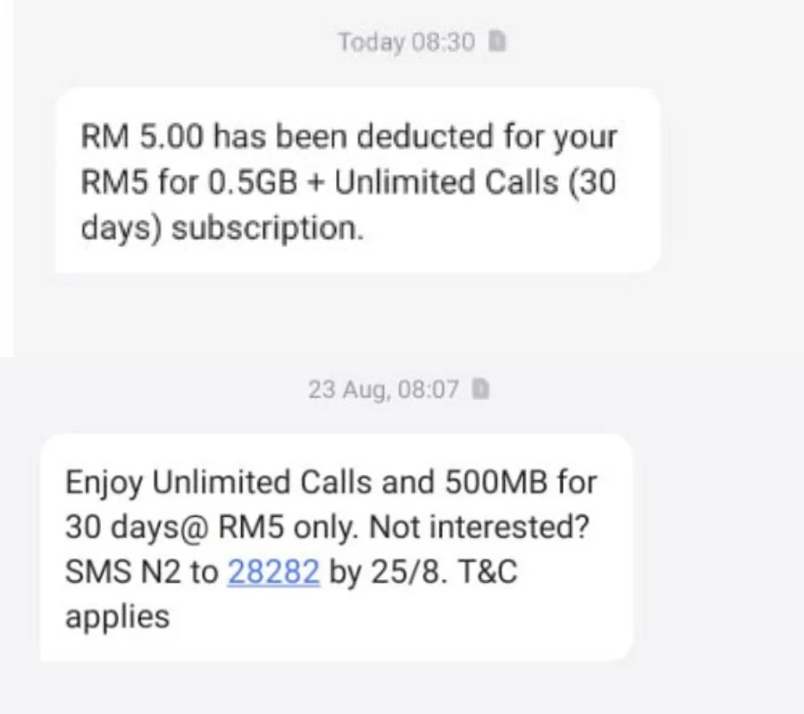 The user, Capt. Marble shared the message that reads, “Enjoy Unlimited Calls and 500MB for 30 days@ RM5 only.” According to the message, users who are not interested in the promo should reply by the specific date given. Usually, not replying to a message should already be enough to indicate that the user is not interested. However, RM5 was still deducted for “subscribing” to the new plan.
