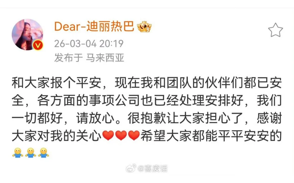Chinese actress Dilraba Dilmurat (迪丽热巴) had fans worried after news outlets reported that she was stranded in Dubai amid the recent tensions in the Middle East. Thankfully, the star is now safe and sound in Malaysia.