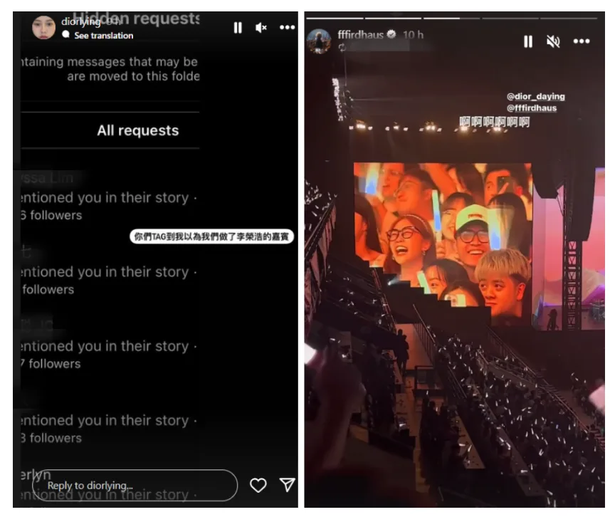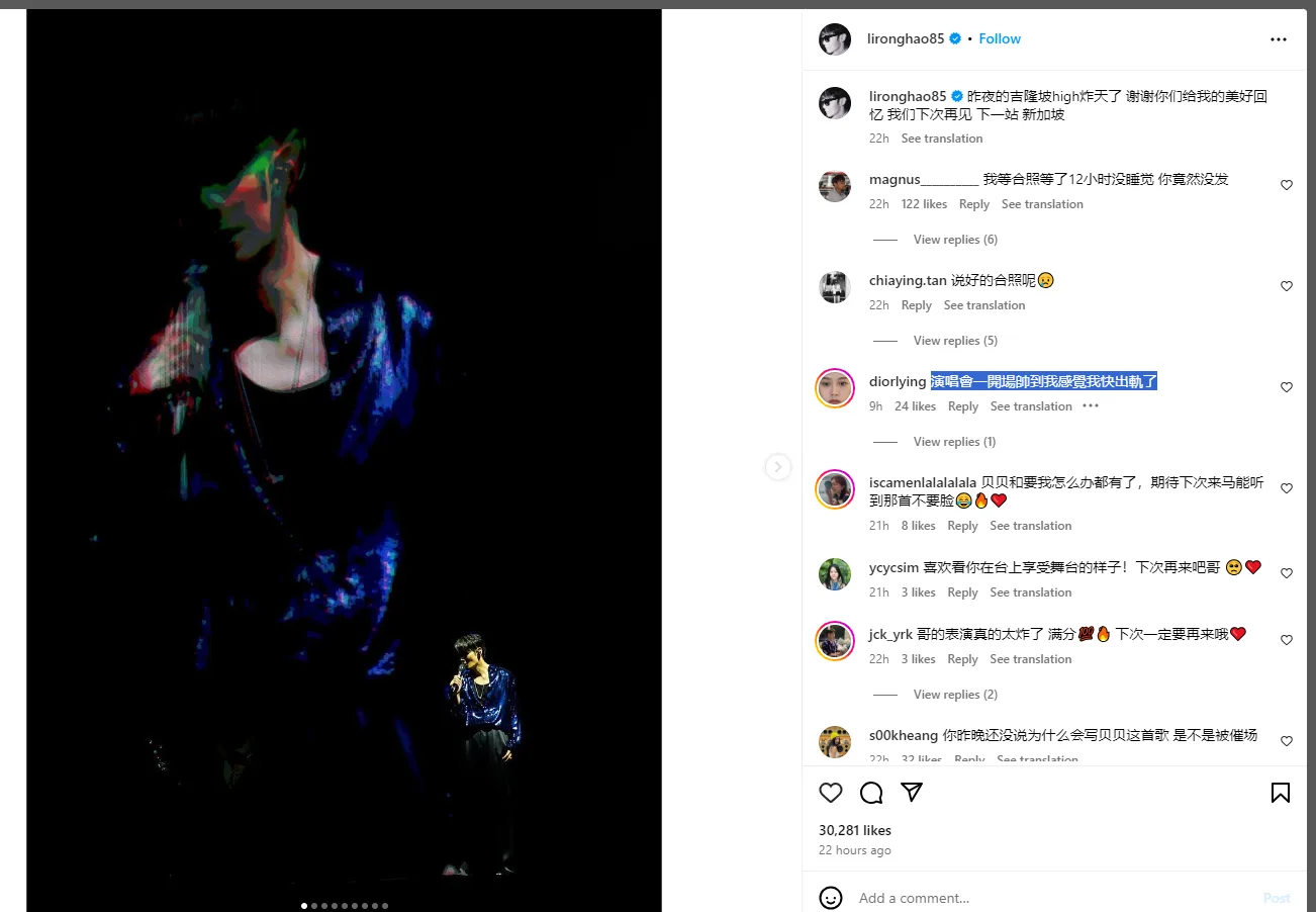 The next day, Diorlying Tan (Dior大颖) took to her Instagram Stories to share about her concert experience. “Do you know what’s so cool about Li Ronghao? The minute he came onstage, it was… Wa Sai! Speechless. He has the X-factor that make fans not only idolise him but also aspire to become like him. Not only does he excel at playing drums and guitar, but his energy onstage is also infectious,” the Malaysian star raved about the idol.