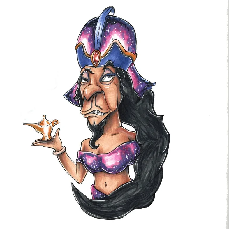 Instead of making Jafar look like a doppelganger of Princess Jasmine, this version looks like what could be Jafar’s sister, Jara. The original Jafar is far from attractive and Jara seems to take after her sibling. This art piece also provides Jara the famous trademark beard. With that magic lamp on her hand, what do you think Jara is wishing for?
