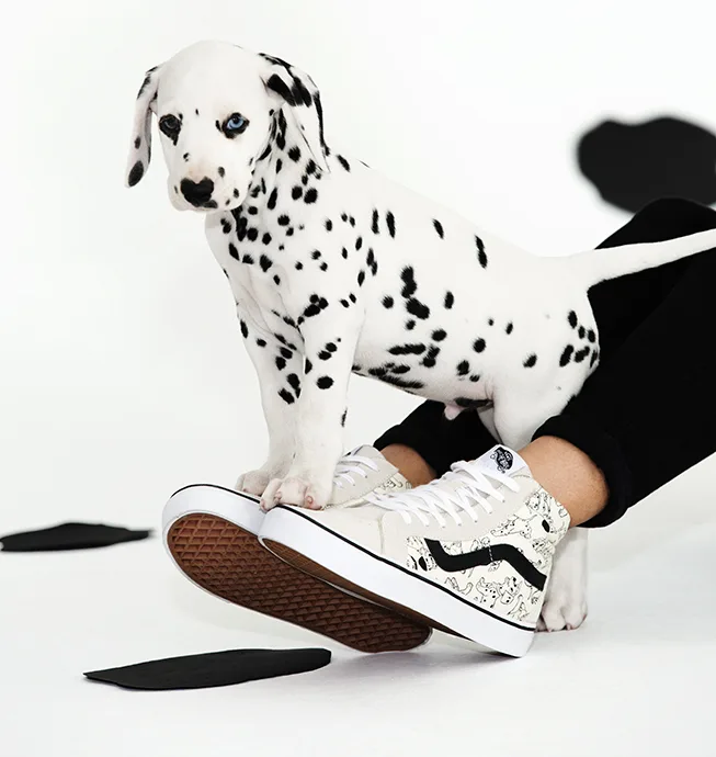 Disney’s Dalmatians come together for special colorways of the Vans Sk8-Hi Reissue in white and Authentic in red. Within the pattern furry friends can be seen in playful poses and upon closer inspection, one can spot a dalmatian chewing on his favorite shoe, the Vans Classic Slip-On. Both styles are available in adult size runs while the Authentic will be taken down to kids and toddler sizing.