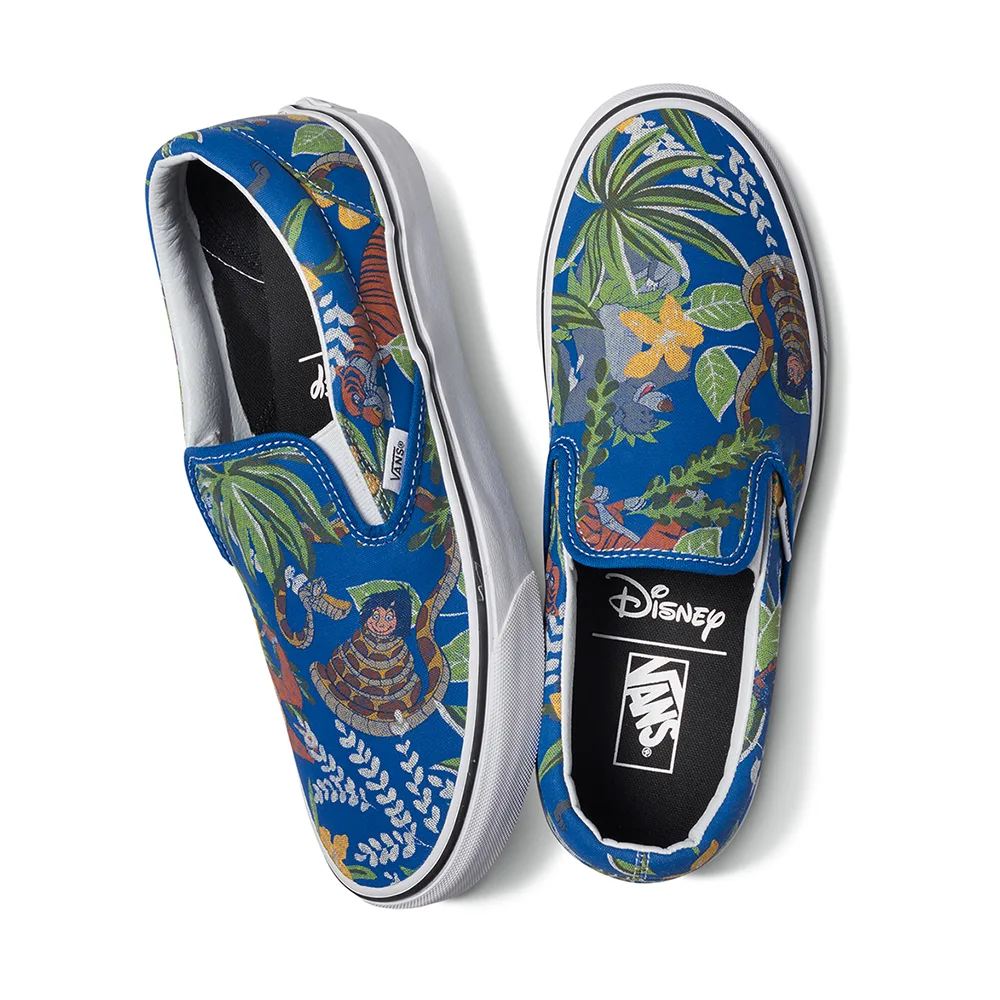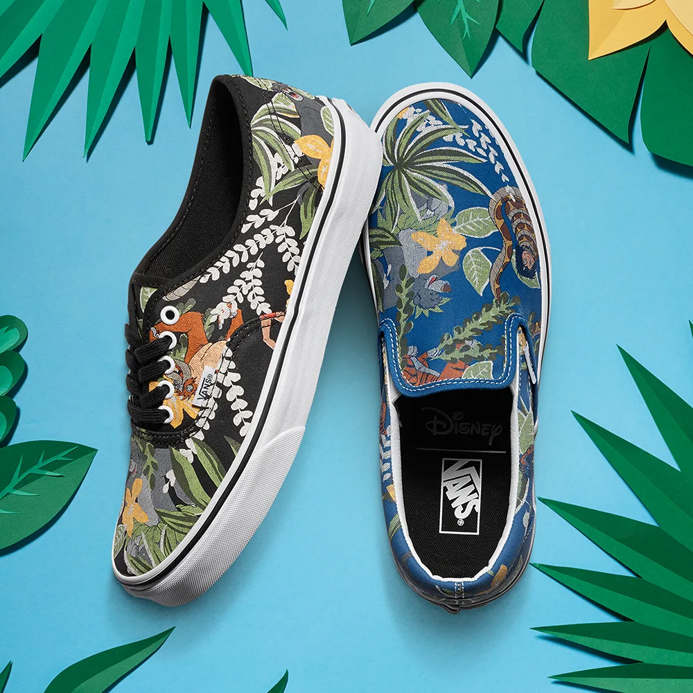 All 5 characters are blended into a vintage Vans pattern to create a floral camouflage-style print for the Vans Classic Slip-On in adult sizing and Vans Authentic in adult, kids and toddler fits. “The Jungle Book” apparel includes a raglan, bucket hat, backpack and socks designed for men.
