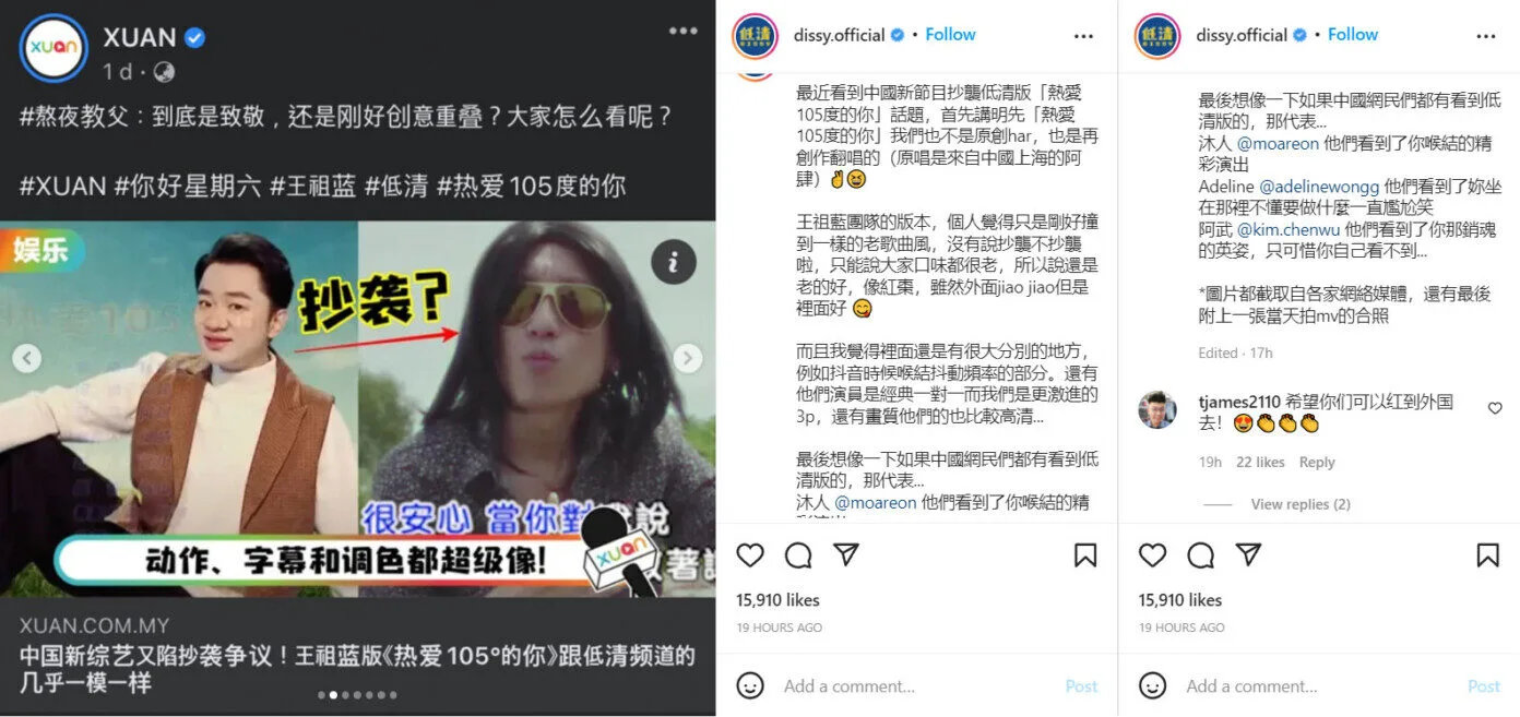 Although the style seemed the same, Dissy stated there were still differences. Such as Cho Lam’s “Adam’s apple jitter” during one part of the song, Cho Lam’s duo instead of Dissy’s trio and the quality of their video. Dissy seemed pleased that many netizens had seen their song, but took the opportunity to tease their artists about it. “They saw (Morn (沐人)’s) Adam’s apple show, they saw (Adeline Wong (黄燕平)) sitting there and not knowing what to do, and they saw (Kim Chen Wu (金塵武)’s) ecstatic and heroic appearance, but unfortunately, you can’t see it yourself…” Dissy wrote.