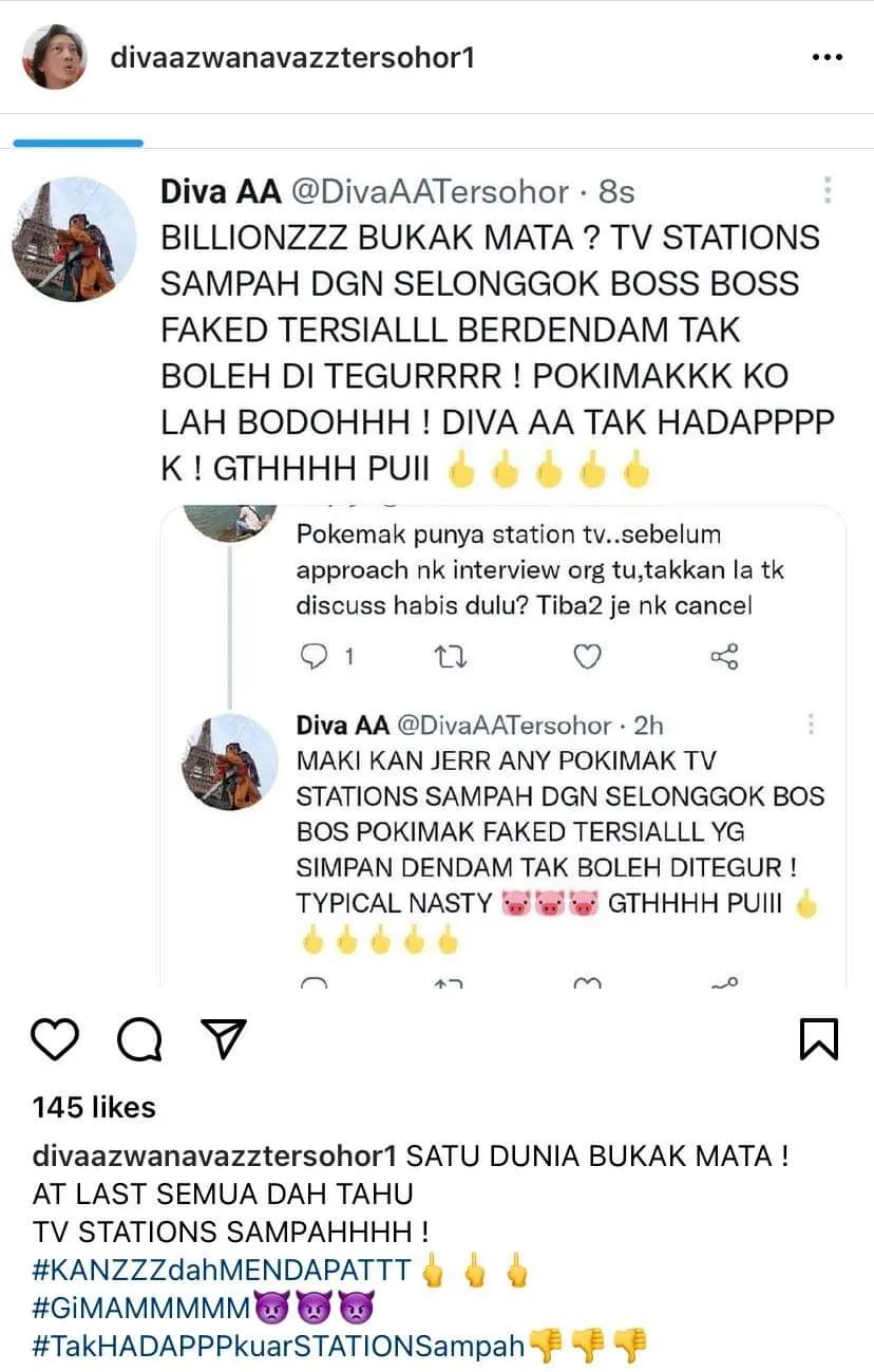 “I’ve been keeping this story for a year, beginning from the last season (I hosted), up ’til the new season of this stupid programme which will be airing this Sunday. I kept my mouth shut and didn’t reveal the real story. Just (you) wait. You think you have all the power just because you’re the big boss here? Fake bastard. Trash TV station,” Azwan wrote.