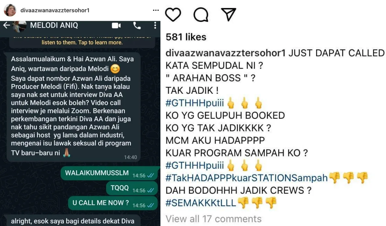 According to Murai, the production team had decided to call off the interview at the very last minute after they received the order from their “boss”. Seemingly displeased by this, Azwan commented on his IG, “You guys were the ones who booked me (for the interview), but then, you ended up cancelling the session? As if I’m eager enough to appear on your trash show.”