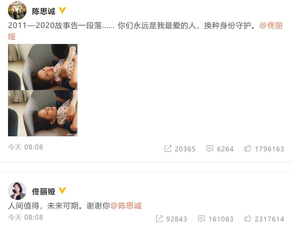 Chen made the announcement by posting photos of Tong and their five-year-old son. He captioned the photos with “From 2011 to 2020, the story ended. You will always be the ones I love the most, I will guard you with a different identity now.” Tong responded to the post with, “I had a worthwhile time and am looking forward to the future. Thank you.”
