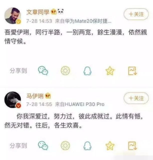 Their public announcement was made on 28th July. Ma wrote, “We loved each other. We tried hard and completed each other in the past. We may have regrets over our relationship, but there is nobody in the wrong here. I hope that in the future, we can both lead happy lives.” Wen also penned a post on his own, saying, “I love Ma Yili, (we) walked together halfway and separated. There’s still the rest of our lives, (we) will still be protecting each other as family.” According to netizens, this was the most poetic announcement.