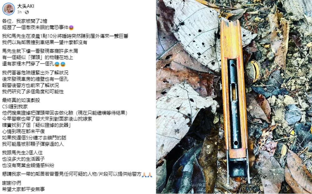 The MY FUN咖来玩 DJ took to her socials around 12pm today to share the shocking event. “Guys, my house was shot (at) twice,” Aki wrote. “(I) experienced a sleepless night of horror.” According to Aki, she and her husband had gone to bed at 1.10am when they heard a loud noise from outside.