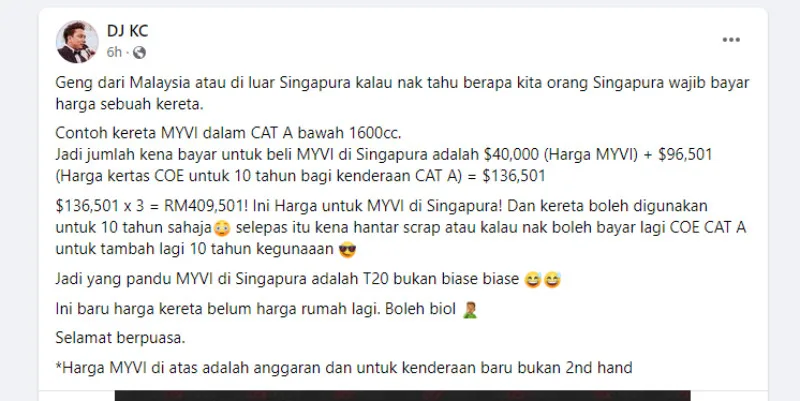 Earlier today (Thursday, 6th April), a Singaporean DJ known as DJ KC posted on his Facebook to share a shocking revelation regarding how much the people of Singapore have to pay for a car. In his post, he revealed that the Perodua Myvi car is considered a luxury car in Singapore with a total price of $136,501 SGD (RM409,501) including the COE (Certificate of Entitlement) for 10 years!