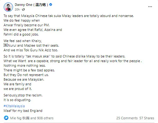 “What we want is a capable, strong, and fair leader for all (who is willing to) really work for the people. Nothing more, nothing less.” Danny wrote. “There might be a few bad apples, but they do not represent us. Because we are (Malaysians). We are a family and we are proud of it.”