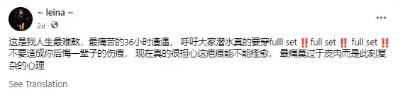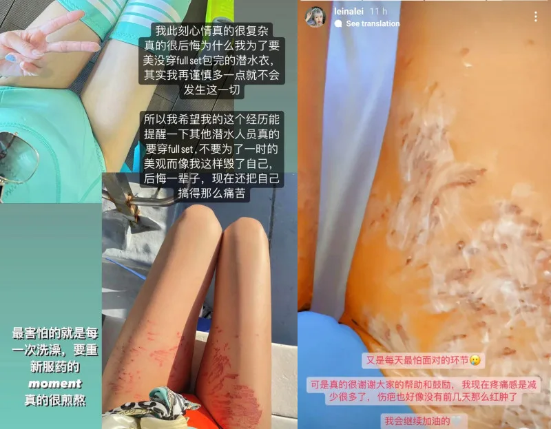 DJ Leina Lei advised her followers to always wear the full diving suit set when going diving. “This is the hardest and most painful 36 hours of my life,” she said. “Don’t cause scars that you regret for the rest of your life.” She also hoped others would treat her experience as a lesson. As for Leina herself, she shared that the scars had left her concerned about how her legs would look to others.