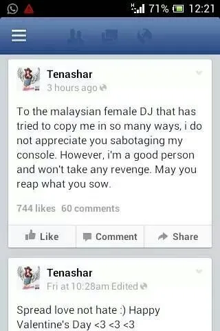 Singaporean DJ Tenashar has started a war against local DJ Leng Yein on her Facebook page! DJ Tenashar accused DJ Leng Yein of sabotaging her console at the Hotlink Da Mouth & DJ Tenashar Live in Concert at Sunway Lagoon on February 15th, 2014. Apart from accusing DJ Leng Yein of sabotaging her console, the Singaporean DJ bombshell also called Leng Yein a copycat who’s been trying to copy her in many ways.