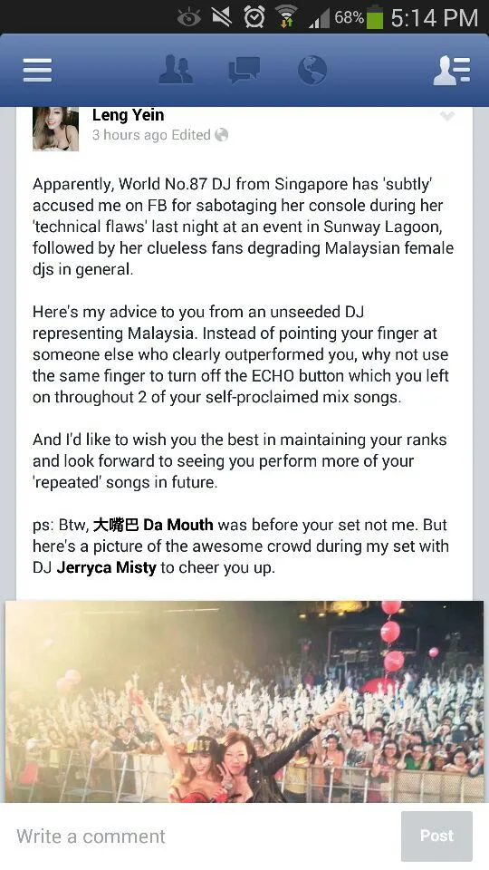 Not pleased with the accusation, DJ Leng Yein took it to her Facebook page to retaliate to DJ Tenashar’s accusation. The Malaysian hottie defended herself by saying it was another DJ who played before DJ Tenashar’s set. DJ Tenashar’s statement has since been removed from Facebook but not before we took a screenshot of it!