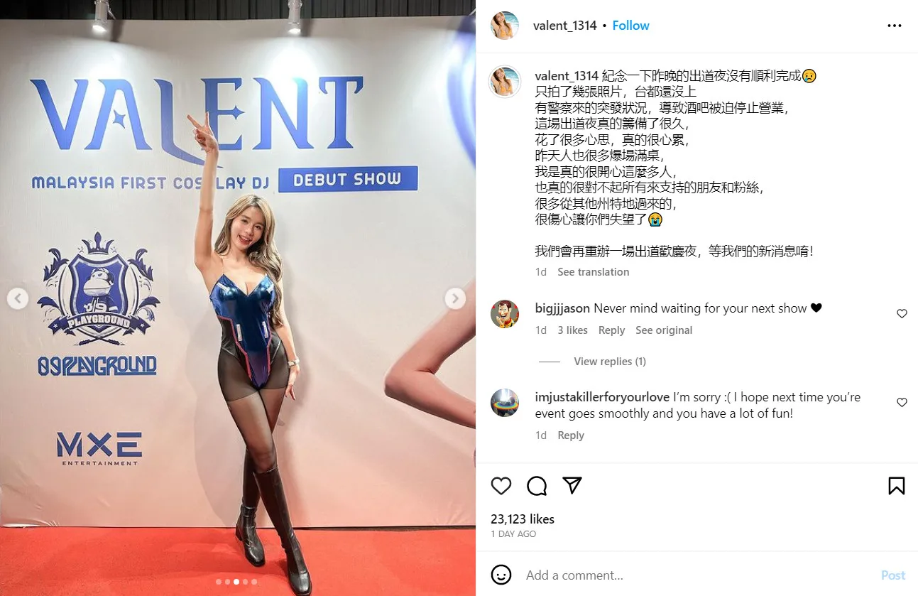 On Sunday (9th April), the influencer shared that her debut hadn’t gone as planned. “I only took a few photos, and (hadn’t even gone) on stage yet,” Valent said. “There was an unexpected situation where the police came and the bar was forced to close down.” She also lamented at the amount of preparation gone to waste, adding that she was sorely disappointed.
