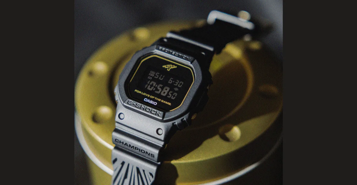 The G-SHOCK x TITAN 22 DW-5600TIT boasts the iconic lightning fist logo gracing its timeless design. The watch’s face and strap feature an original lightning pattern, accentuated by bold ‘World Champions’ lettering on the case back and packaging. Championing the spirit of victory, the packaging gleams in triumphant gold, blending the G-SHOCK DW-5600’s silhouette and TITAN 22’s lightning emblem, all while boldly proclaiming ‘World Champions’ to signify this epic collaboration.