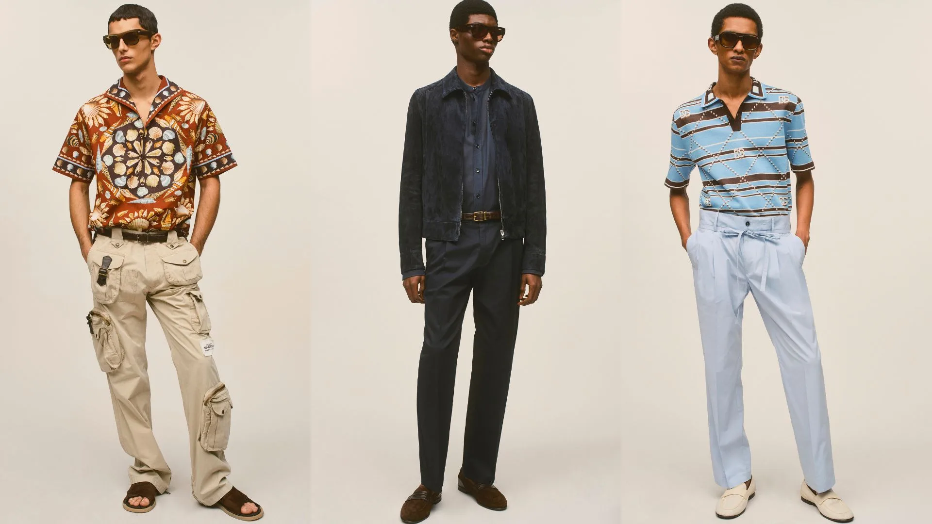The double-breasted suit is paired with cargo pants or double-pleated trousers, while denim, leather, and trench coats expand the style options. Accessories complete the wardrobe with consistency and sophistication. The colour palette favours grays, browns, blues, and camel for perfect seasonal looks.