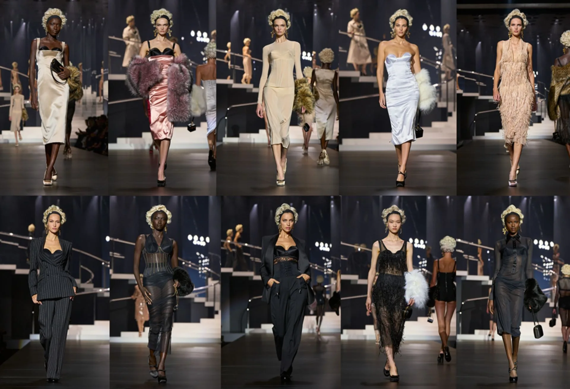 The Dolce&Gabbana Women’s Spring-Summer 2025 Collection embodies the essence of Italian beauty, blending sensuality, attitude, and character while celebrating a powerful, ironic female figure immortalised by cinema. The collection features anatomically tailored jackets and corset details that enhance feminine curves, with fabrics like duchesse, crepe, and lace in a palette of black, nude, red, and white. Iconic prints inspired by floral archives and accessories reminiscent of pin-up styles, such as oversized cross earrings and Sicily bags, complete the looks. Drawing inspiration from Madonna—who has been a significant influence on the brand—the collection highlights Italian seduction through enhanced bras, strings, and corsetry, showcasing a confident femininity.