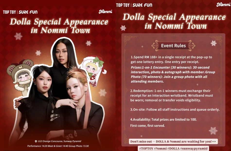 Top Toy Malaysia and Nommi recently opened a pop-up store at Sunway Pyramid, with exciting promotions, events and activities running until 28 December. In one of its latest posts, the brand revealed that Malaysia’s biggest girl group, DOLLA, will also be making a special appearance at the mall’s Nommi Town Christmas pop-up store for the Top Toy launch!