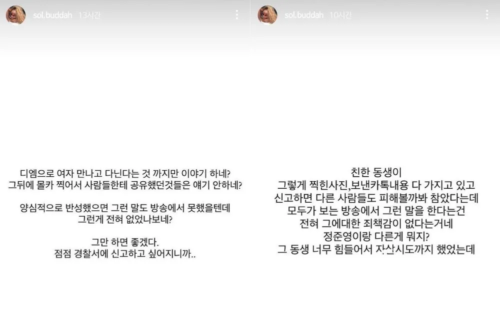 However, her story didn’t stop there. Mills’ wife claimed a close ‘donseng’ (junior) of hers had suffered the indignity. “We have the messages you sent,” she told the perpetrator. “I haven’t called the police in case it might affect other victims, but seeing you talk this way on a broadcast watched by so many just goes to show you have no guilt. How are you different from Jung Joon Young?” To make matters worse, Mills’ wife also revealed that her junior had tried committing suicide after the scarring incident.