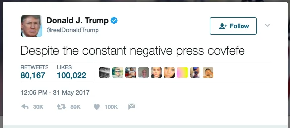 “Despite the constant negative covfefe,” he said. Nevermind that nobody has any clue what he was referring to, nobody even knows what “covfefe” means. We can safely assume he was trying to say, “Despite the constant negative coverage”, but the tweet came out of nowhere.