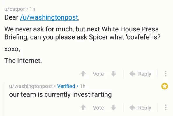 Of course, the internetz quickly jumped in on the typo and made it its life mission to popularise the covfefe.