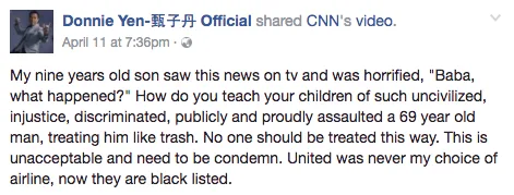 Recently, Hong Kong actor Donnie Yen took to Facebook to criticise United Airlines for violently dragging a passenger, known as 69-year-old David Dao, off an airplane.