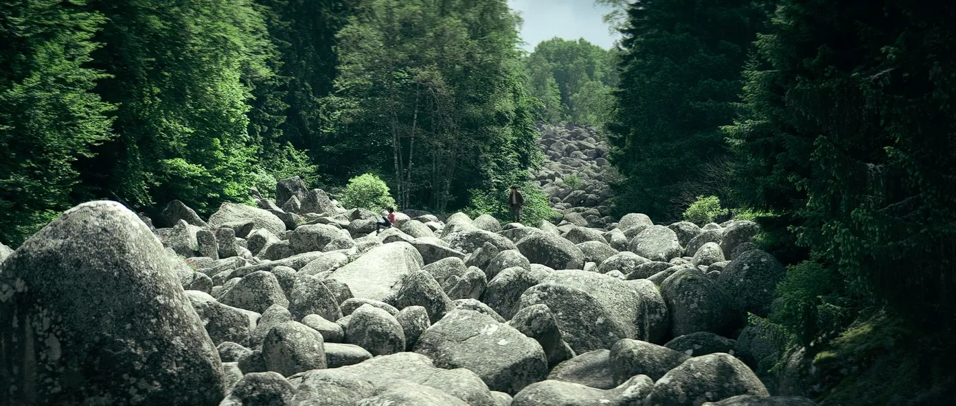 As she inches closer to the edge, she looks down upon the forest sea below, allured by the green pastures that seemingly lie ahead. She tenses up for the first time in this film, frozen as she stares down into the depths.