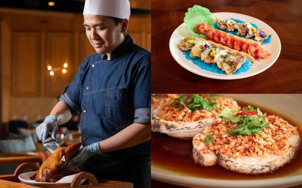 A highlight of the evening is the live Peking Duck carving, where chefs present the crisp, golden-skinned duck carved tableside — a theatrical centrepiece that blends tradition with celebration. The feast concludes with classic Chinese desserts, offering nostalgic sweetness to round off the evening.