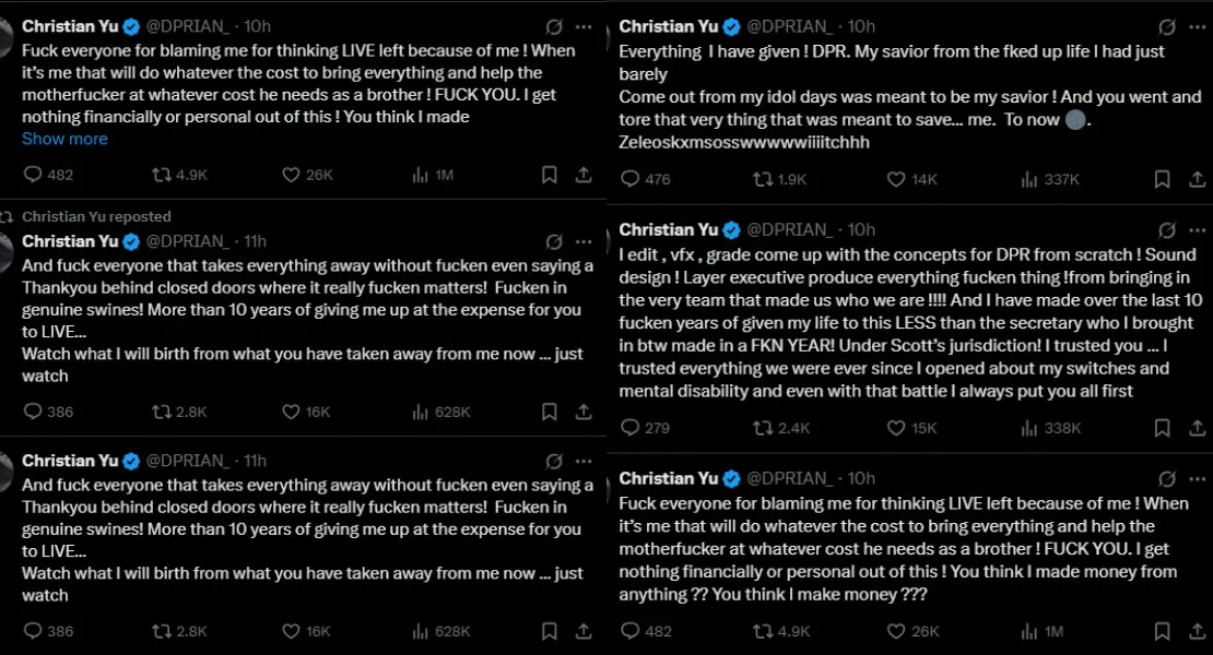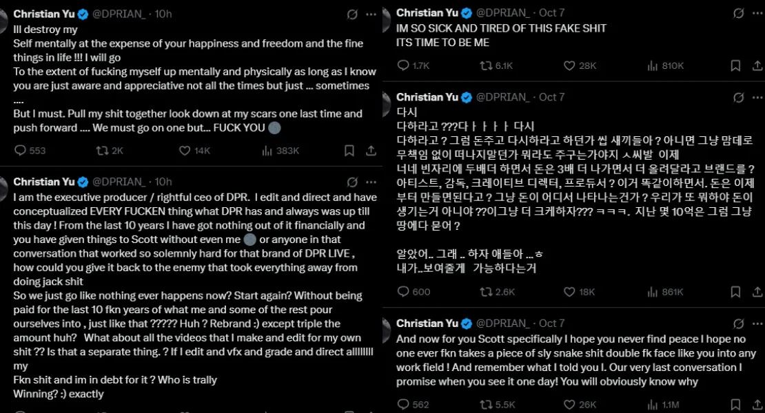 Christian Yu, better known as DPR Ian (유바롬), has seemingly reached a breaking point amid ongoing conflict within his label, Dream Perfect Regime (DPR). The artist took to Twitter yesterday (Tuesday, 7th October) to express his frustration, revealing that he had been keeping certain matters to himself for a very long time.