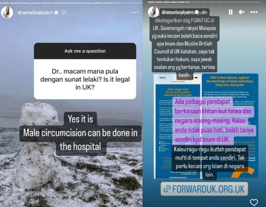 Nonetheless, this has in turn sparked a heated debate among local netizens. Following that, Dr. Amalina once again took to her socials to issue her response to the backlash. According to her. “khitan” (circumcision) for female babies is categorised as Female Genital Mutilation (FGM) or Female Genital Cutting (FGC) in the UK.