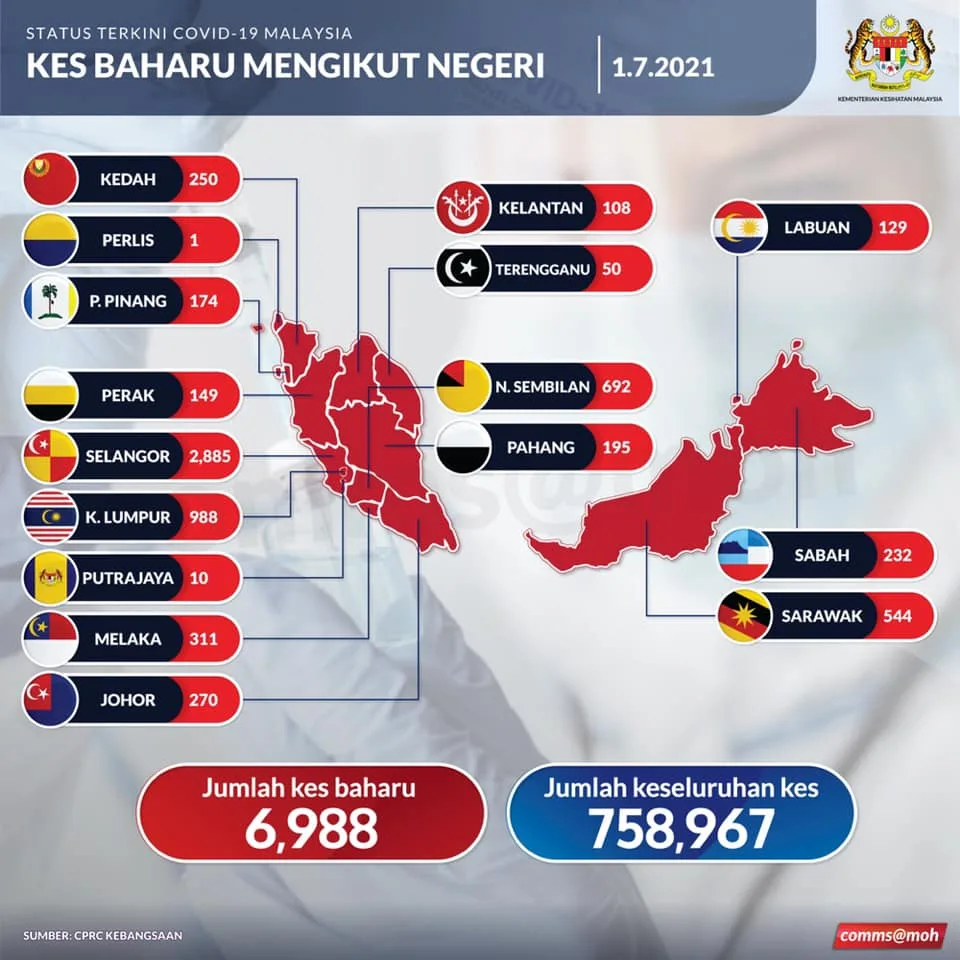 Dr Noor Hisham also reported that Malaysia must achieve the current reproduction number (Rt) below 1.0 in order for Covid-19 cases to be subdued. Malaysia reported 6,988 new cases on Thursday, 1st July 2021.
