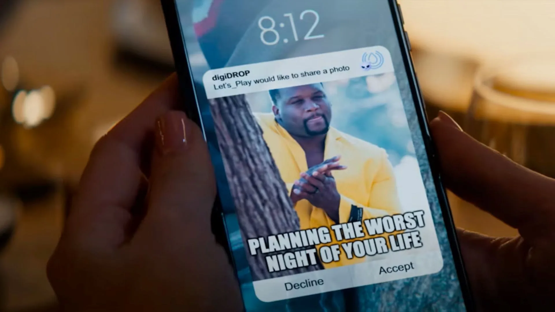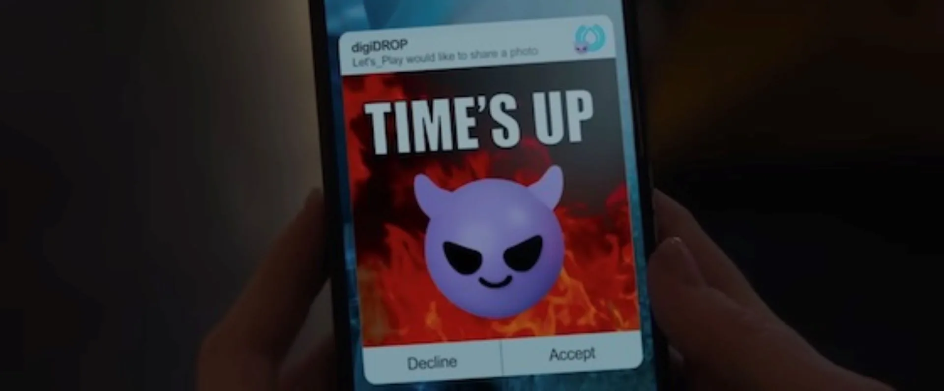 DigiDrop is one of the most interesting elements of the film. The app sends messages to devices within a 50-foot radius, meaning the threat is someone in the immediate vicinity. This creates an undercurrent of constant suspicion that taps into our digital anxieties.