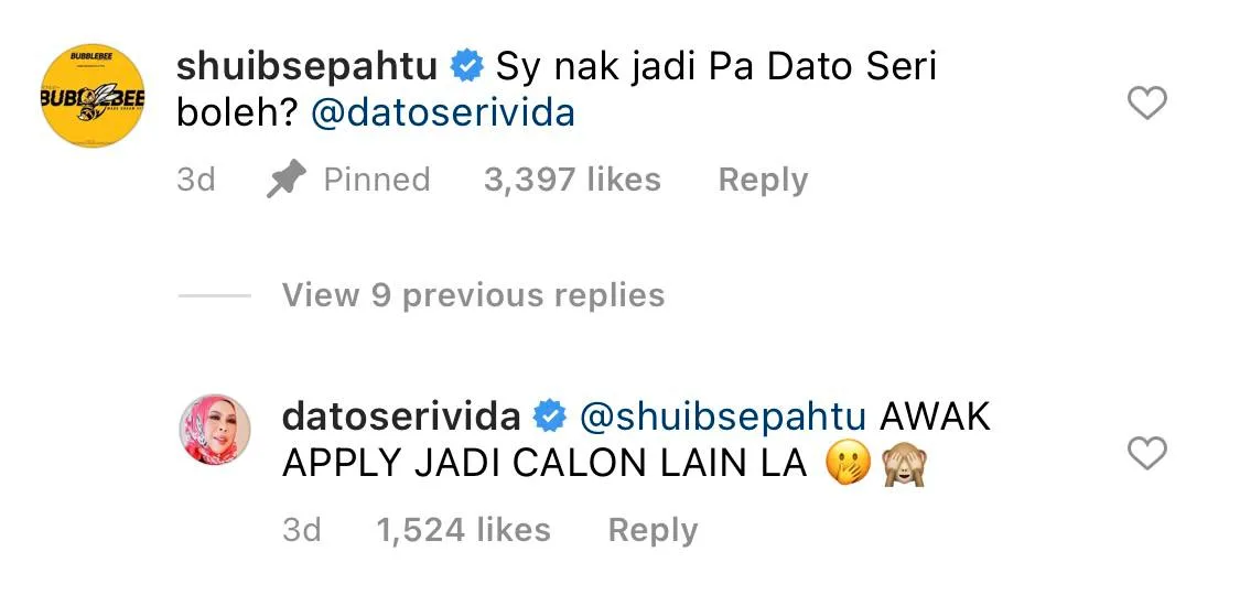 Shuib even commented on her post, “I would like to be your personal assistant, can I Dato’ Seri?“, to which the Kelantanese lady boss entrepreneur replied, “You should apply as an applicant for something else.” Both of the comments have amassed thousand of likes and reaction. Some netizens even joked, “Are you looking for a personal assistant or a lover, Dato’ Seri?”