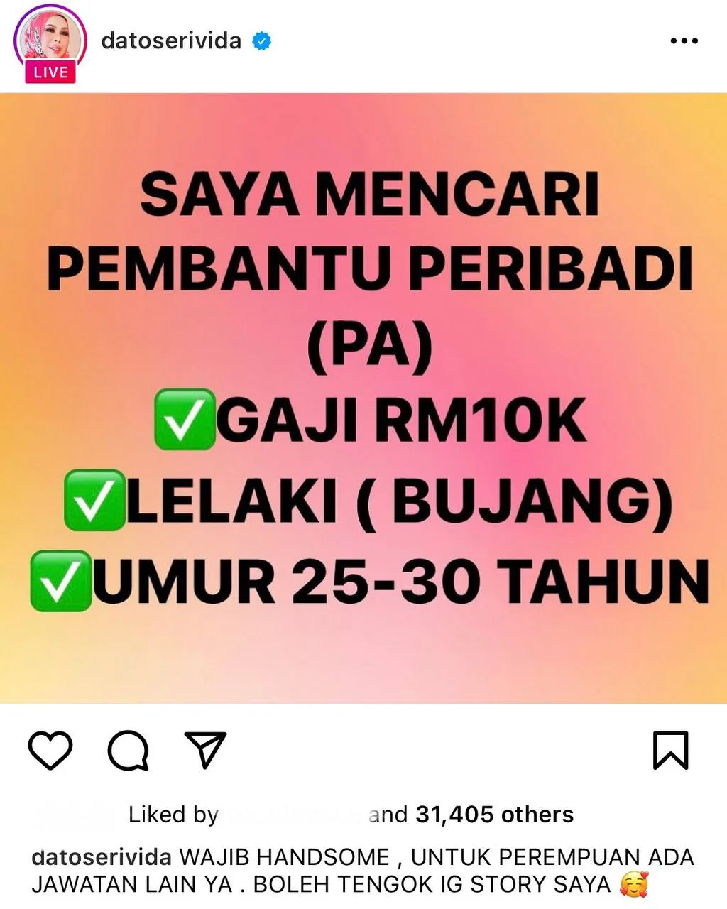She has advertised the vacancy slot through a post on her personal Instagram and included some criteria. She posted “I’m looking for a personal assistant (P.A), salary RM10k, male (single), aged 25 – 30 years old” and captioned it with “Handsome is a necessity, there’s a different position for females. Please check my IG Story.”