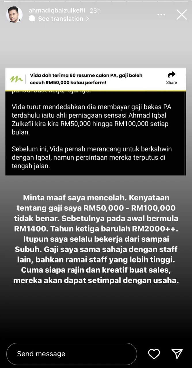 Iqbal Zulkefli, DSV’s former personal assistant has come front to reveal his side of the story. He has posted an Instagram story regarding the actual amount of his salary when he was working as DSV’s personal assistant. He stated how he was working ’til dawn yet his salary was only RM1400, and only by his third year of working it was increased to RM2000 plus. He mentioned how his salary was no more than any of the other average employees, some even earned more than he did because, “Who is more hard working and creative in earning sales, they will be reaping what they sow,” as to what he said.