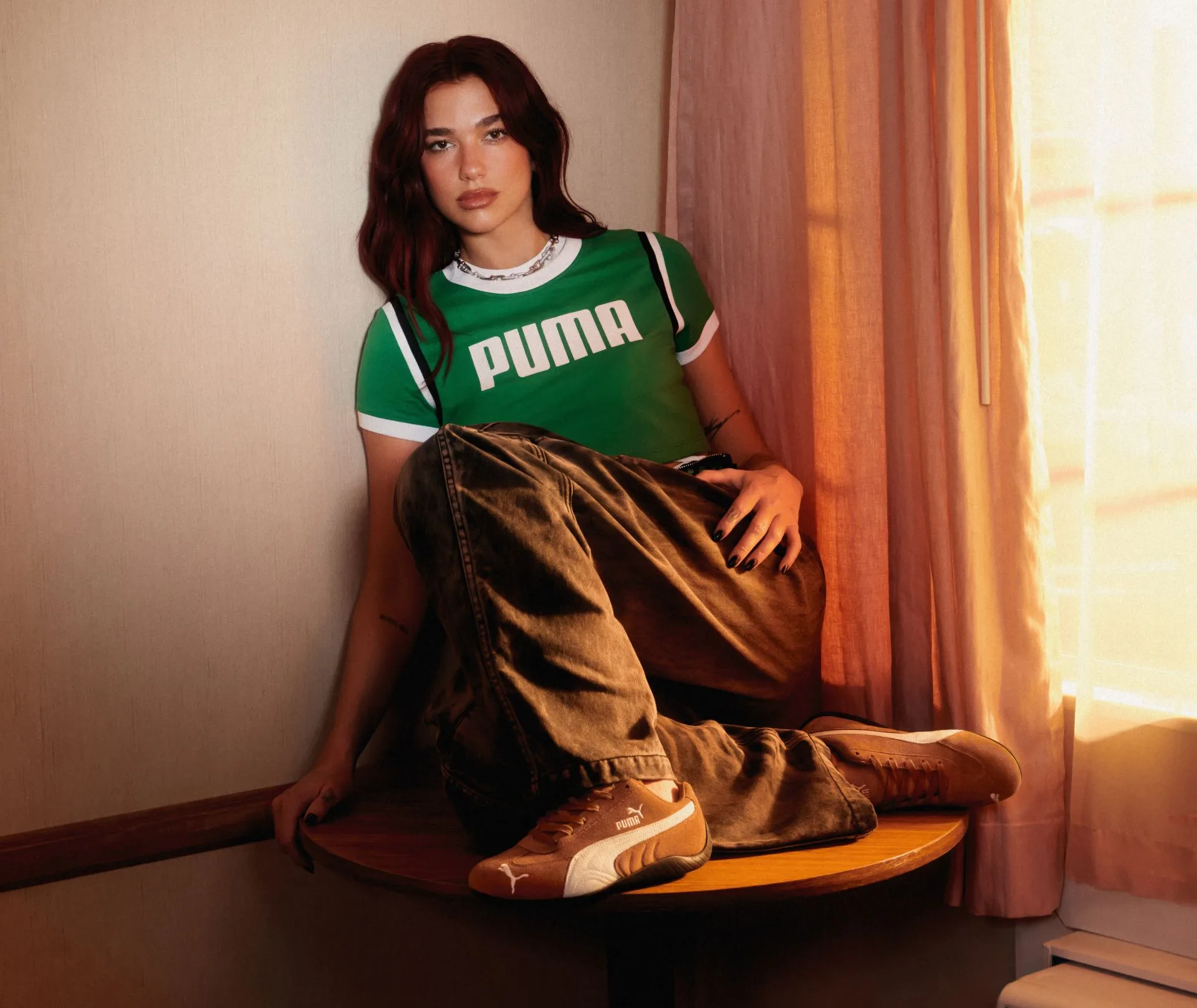 Cruising in a classic ride and making spontaneous pit stops along the way, her path takes her through diners and other iconic roadside spots. As she embraces the journey, Dua Lipa highlights the Speedcat in Brown, alongside other fresh takes on the silhouette.