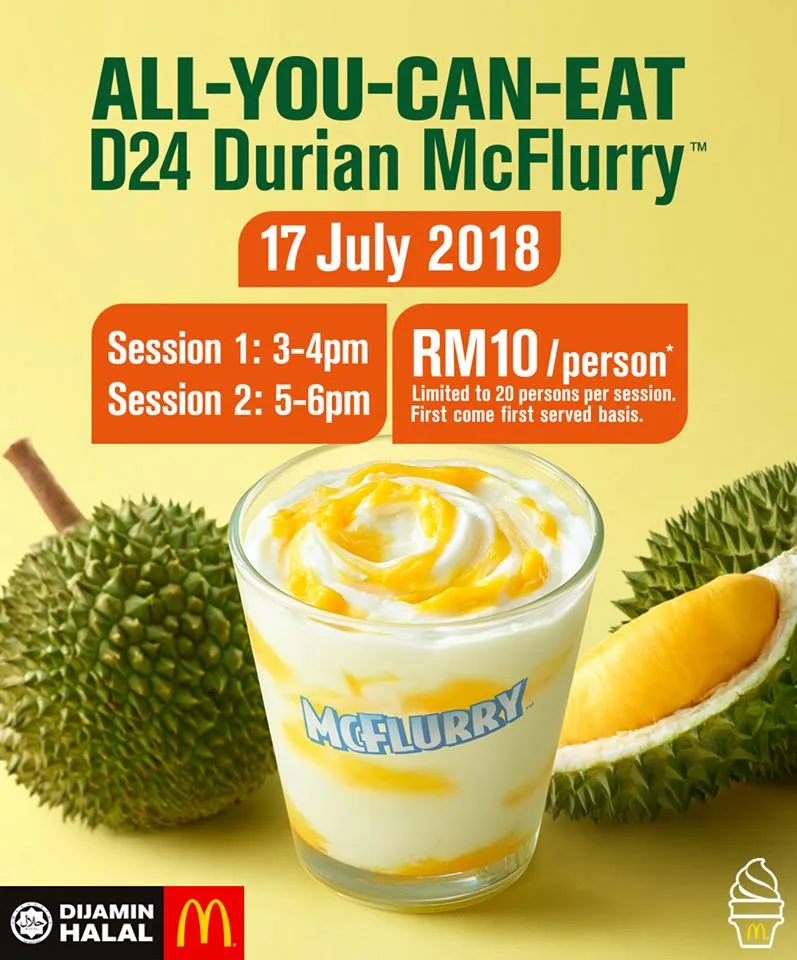 Forget durian buffets. Next week, McDonald’s Malaysia is offering an all-you-can-eat D24 Durian McFlurry promotion. For only RM10, dessert lovers will get to indulge in an unlimited amount of durian ice cream for a duration of 1 hour.