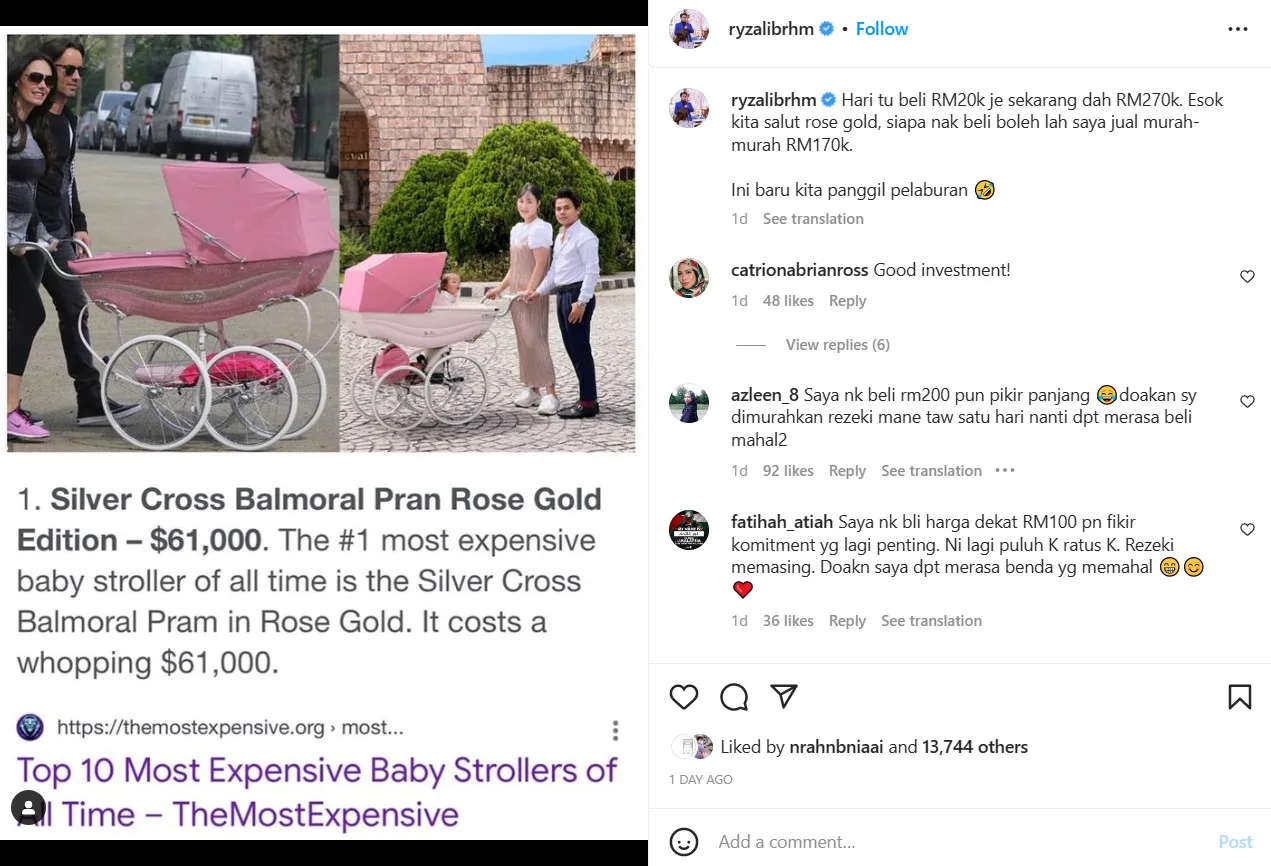 In his post, Ryzal revealed that he bought the Silver Cross pram for RM20,000. However, he later claimed that the price of the pram has now increased to a whopping RM270,000. “Next time, we’ll dip the pram) in rose gold coating. Anyone who’s interested on buying, I can sell it for RM170k. This is what we call an investment 🤣,” he wrote in the caption. As seen in the screenshot shared by the content creator, the UK branded stroller tops the list of the most expensive baby stroller of all time!