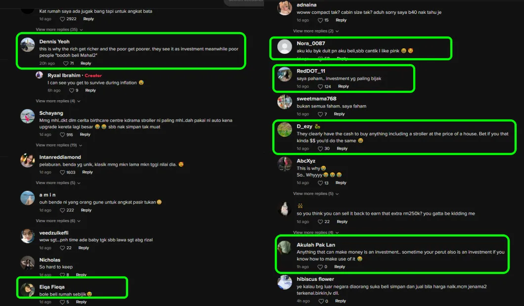 The posting was met with various responses from netizens. “This is why the rich get richer and the poor get poorer. they see it as investment meanwhile poor people will call them stupid for buying such an expensive item,” TikTok user Dennis Yeoh remarked. Another netizen, D_eazy, said, “They clearly have the cash to buy anything, including a stroller at a similar price of a house. You’d do the same if you have a huge amount of money 😁.”