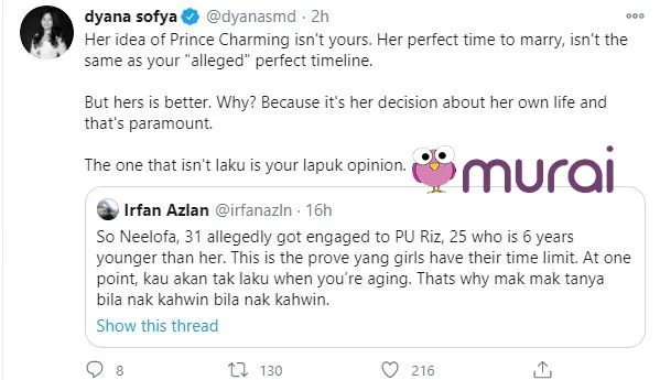 The social media user, known as Irfan Azlan (@irfanazln) wrote, “So Neelofa, 31, allegedly got engaged to PU Riz, 25, who is 6 years younger than her. This is the proof that girls have their time limit.” Worse, he even alluded that no men will want women past their prime age. “That’s why moms out there often ask girls about marriage numerous times,” Irfan added in his tweet.