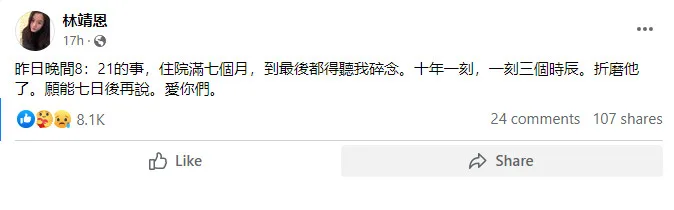 Netizens first heard about the news from Eason’s son when he made a post on Facebook claiming his father was “lying on the hospital bed (and) dying“. Jing-En later confirmed the news with a post on her own socials. “(It happened) at 8:21(pm) last night,” she revealed.