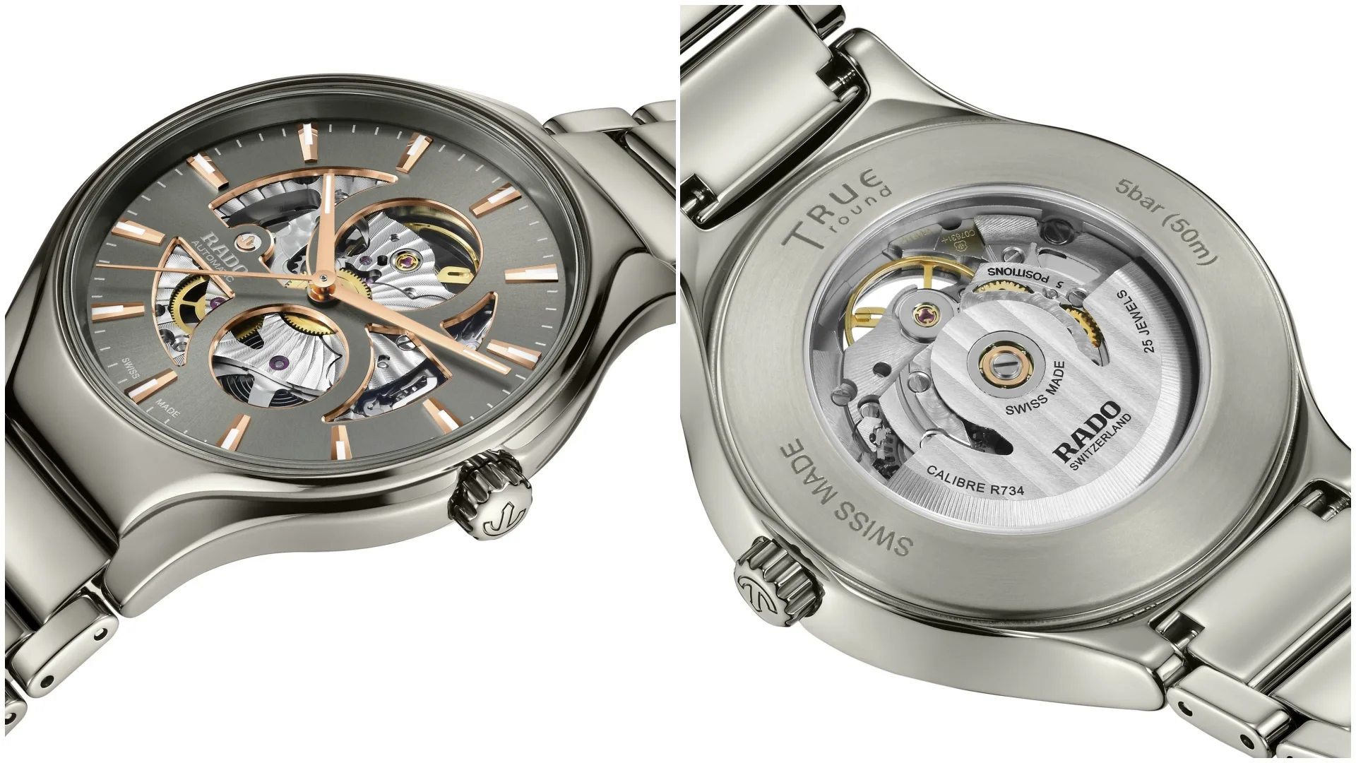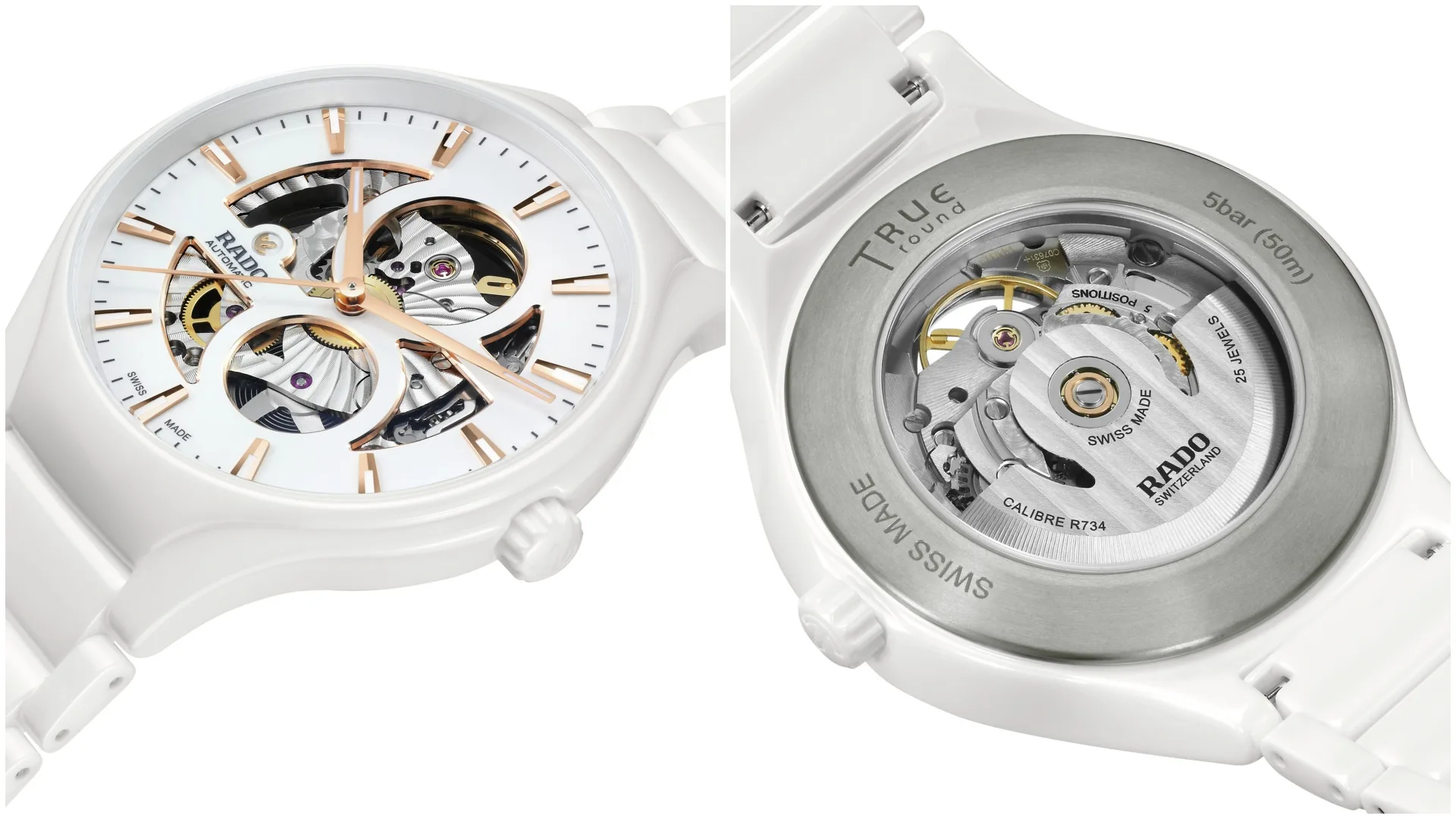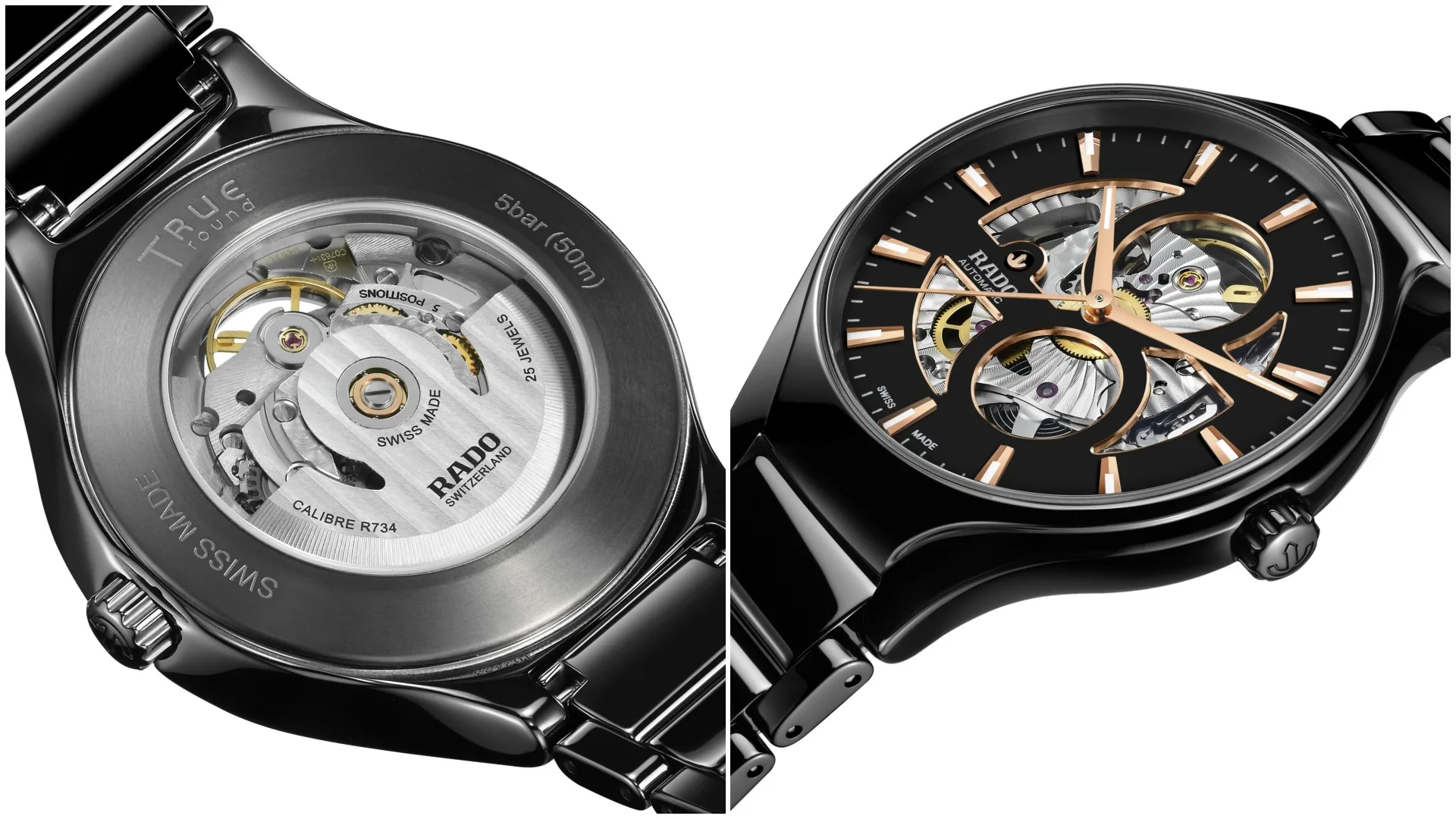 Let’s take a closer look at the four new Rado True Round Open Heart models. All four feature the characteristics that define Rado: high-tech ceramic cases and bracelets as well as cutting-edge design. They also have the bold cutout dial that offers such a compelling look at the impressively finished R734 calibre at the heart of the watch. All the models have rose gold-coloured hour and minute hands and applied indexes with white Super-LumiNova® along with a rose gold-coloured seconds hand. Each one is water resistant to 5 bar (50 metres).