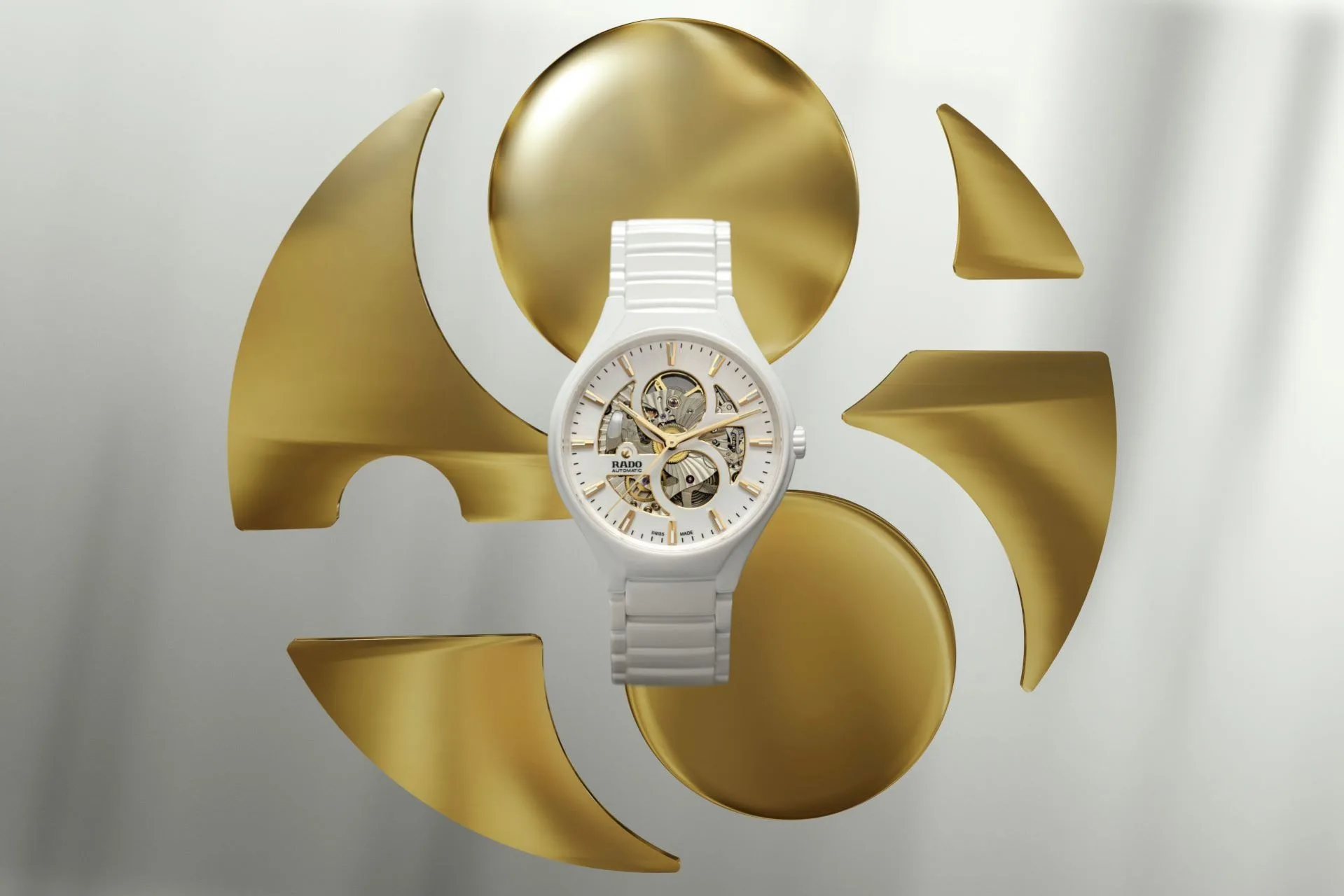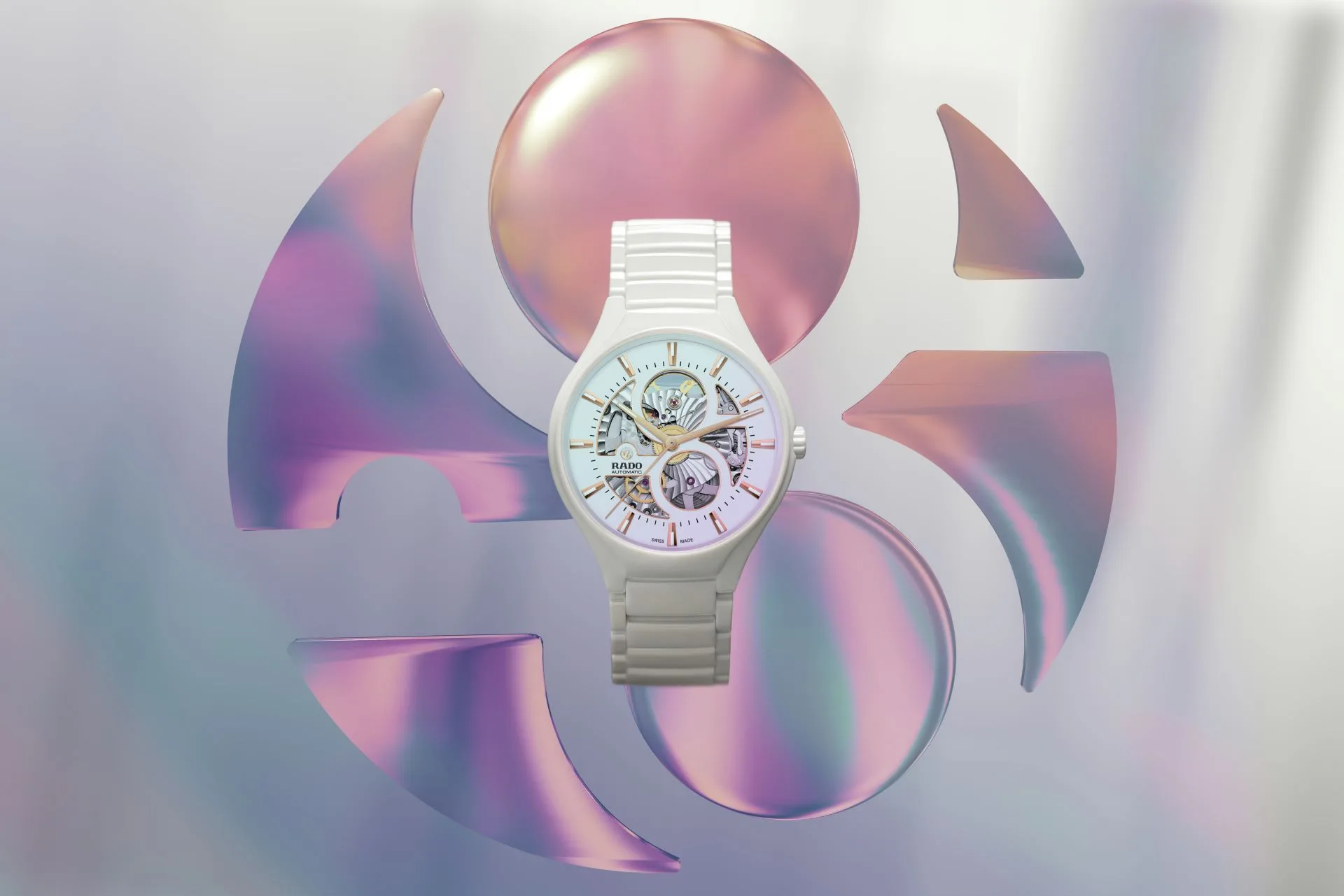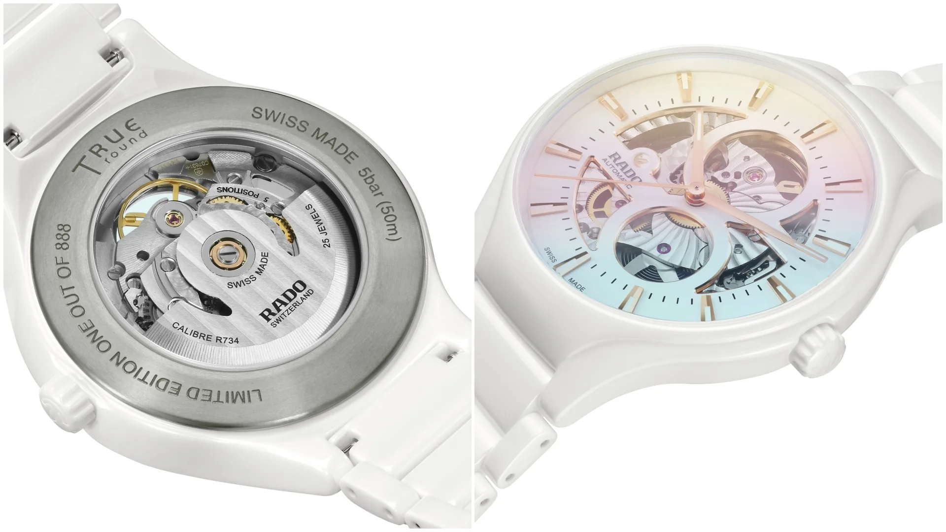 In pleasing contrast to its white sunray dial are rose gold-coloured bevels and applied indexes with white Super-LumiNova®, a rose gold-coloured moving anchor symbol on a white background and a grey printed minute track. The Rado logo is also positioned distinctively on a part of the dial extending from the outer ring to the base of the figure 8. The watch is presented on a polished white high-tech ceramic titanium bracelet with a 3-fold clasp. This special True Round Open Heart Limited Edition timepiece is delivered with a Limited Edition certificate.