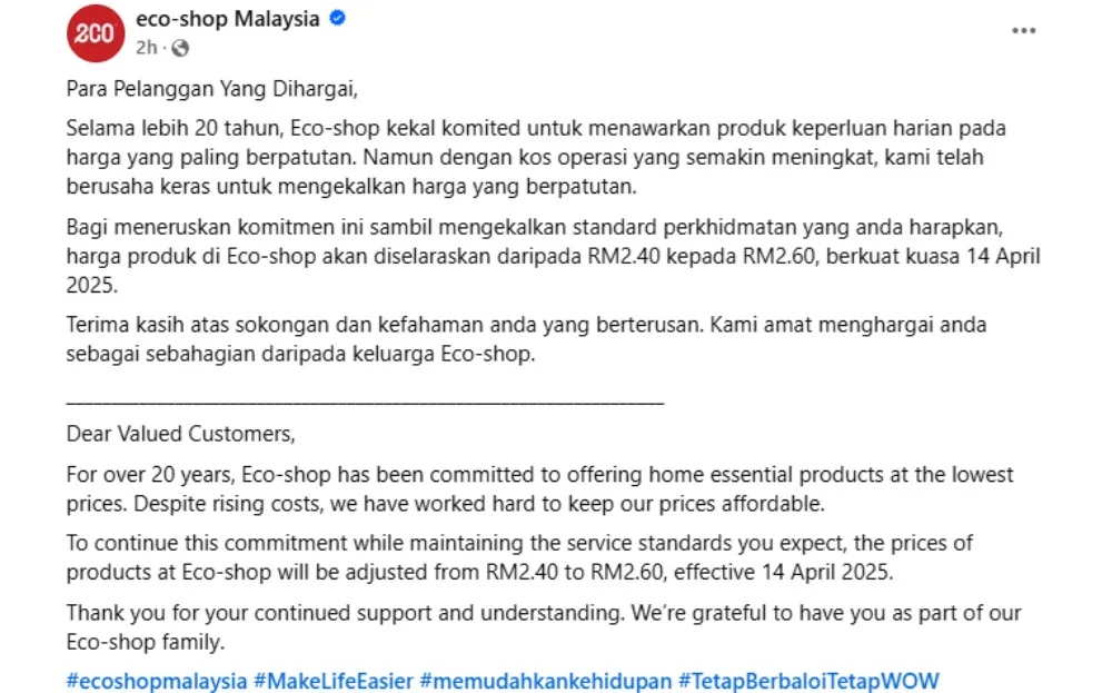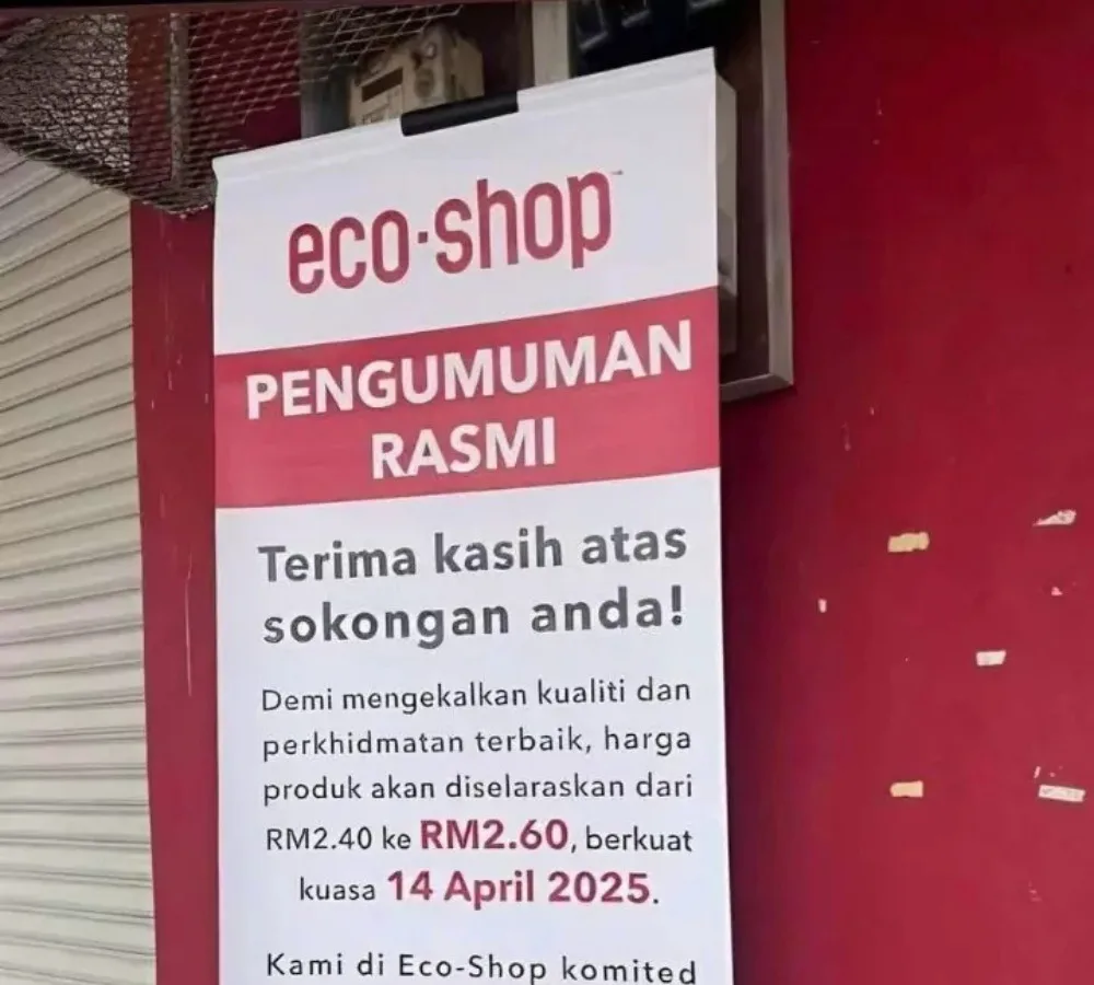 In addition, Eco-Shop stores in Sabah and Sarawak will also see a similar price increase, with items going from RM2.60 to RM2.80 each. The company explained the price hike, saying it was to accommodate rising operating costs while maintaining a good standard of service.
